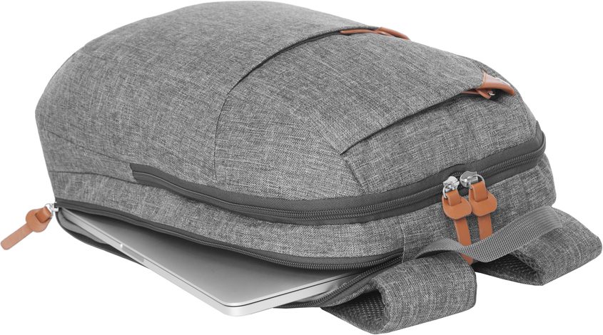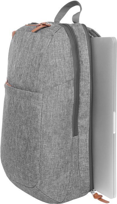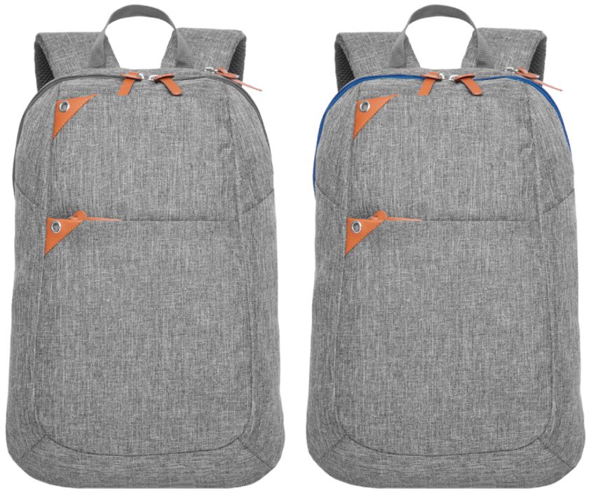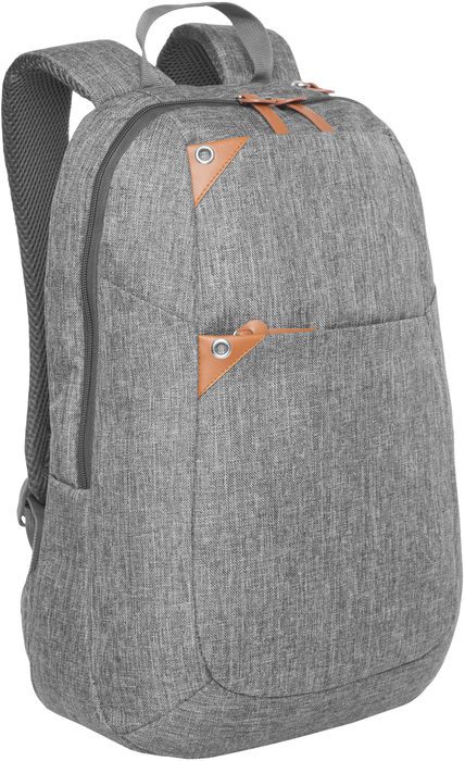 43 x 29 x 11,5 cm (aprox). Capacidad 14 litros. Polyester. Mochila con dos compartimentos acojinados y forrados. Uno de los compartimentos es para portalaptop. Dos bolsillos exteriores con detalles en símil cuero. Correas acojinadas con red que permite la ventilación. Tiradores de cierres en símil cuero. En la parte superior una manilla.