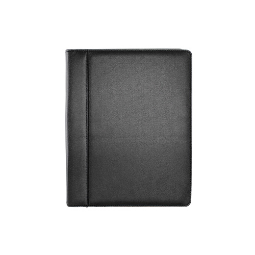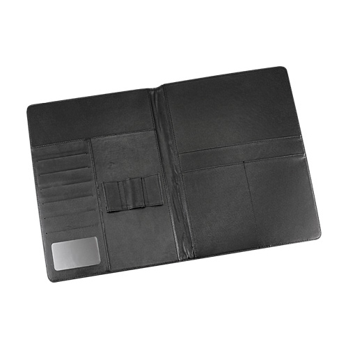 Carpeta Simil Cuero Negro. En el interior incluye Bolsillos para documentos tamaño A4, Compartimentos para Tarjetas Y Porta-Lápices.