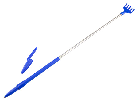 Bolígrafo plástico de color con tapa, con Manito Rascadora expansible (tipo antena). Escritura azul.