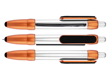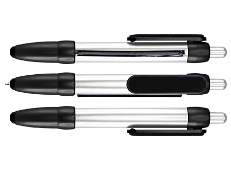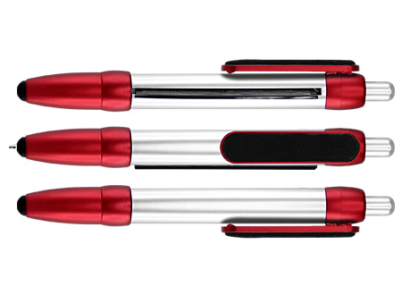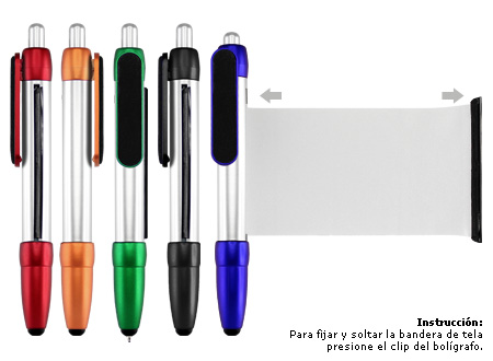Bolígrafo plástico modelo «Flag», con cuerpo plateado y terminales de color metalizado. Incluye bandera retráctil de tela (para impresión), puntero «Touch-Screen» y clip gamuzado negro para limpiar pantalla táctil. Escritura azul.
