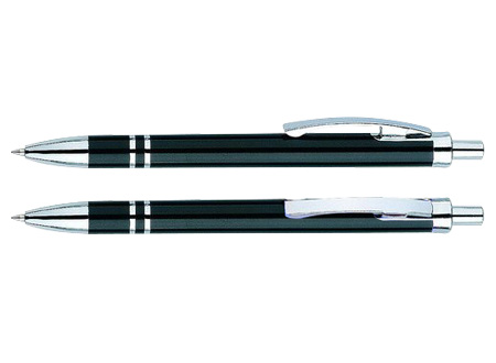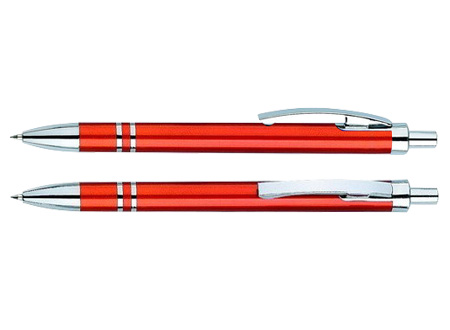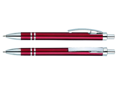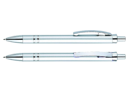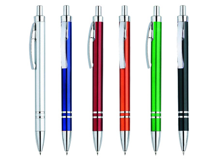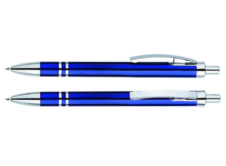 Bolígrafo plástico «Arco» con cuerpo de color metalizado. Escritura azul.