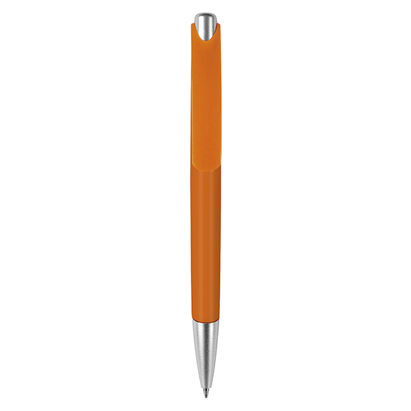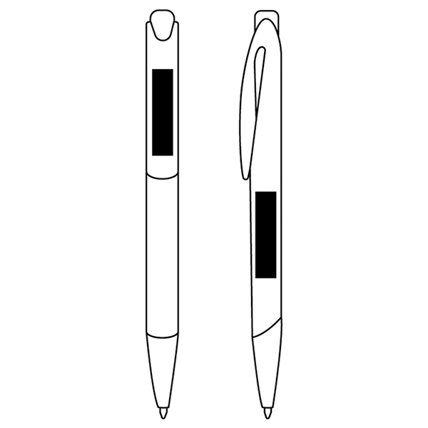 Plástico. Cuerpo de color y detalles de color plata debajo del clip, pulsador y puntera. Tinta azul.