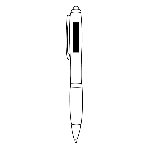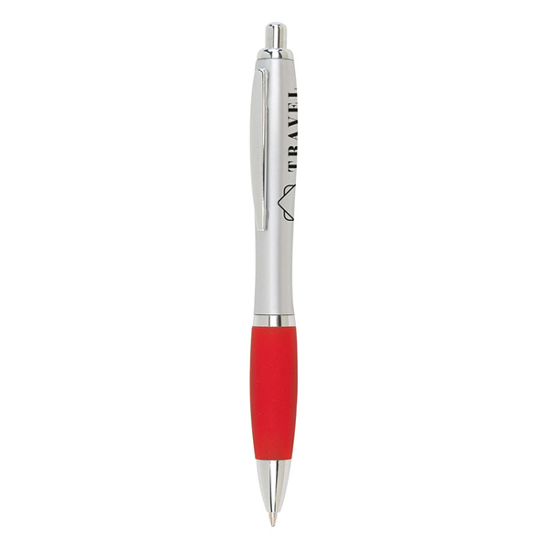 Plástico. Cuerpo curvo, pulsador, clip y puntera color plata. Grip de goma de color. Retráctil. Tinta negra.