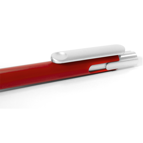 Plástico. Bolígrafo con pulsador. Cuerpo plástico de color. Pulsador, clip y puntera plásticos color plata. Detalle en el clip. Tinta azul.