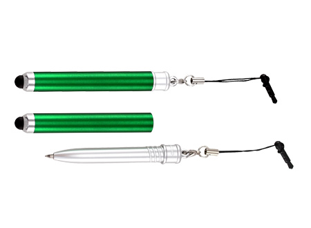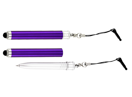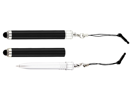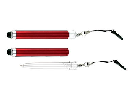 Bolígrafo «Touch-Screen» con cuerpo plateado, tapa de color metalizado y goma posterior negra para pantalla táctil. Incluye práctico soporte plástico para insertar en la salida de auricular del iPhone. Escritura azul.