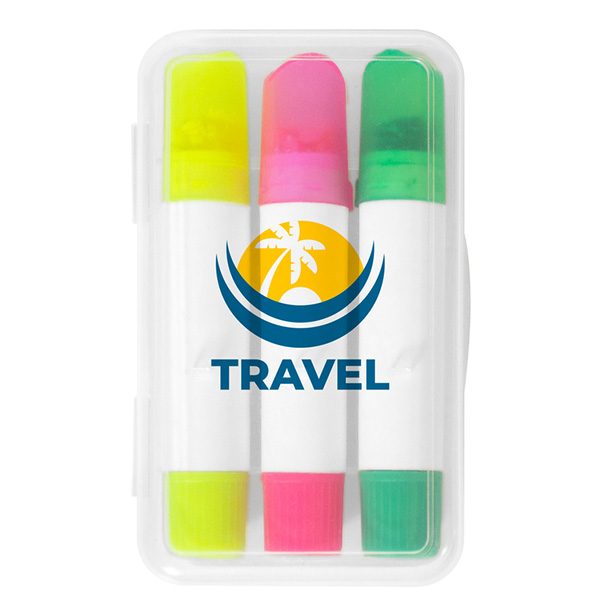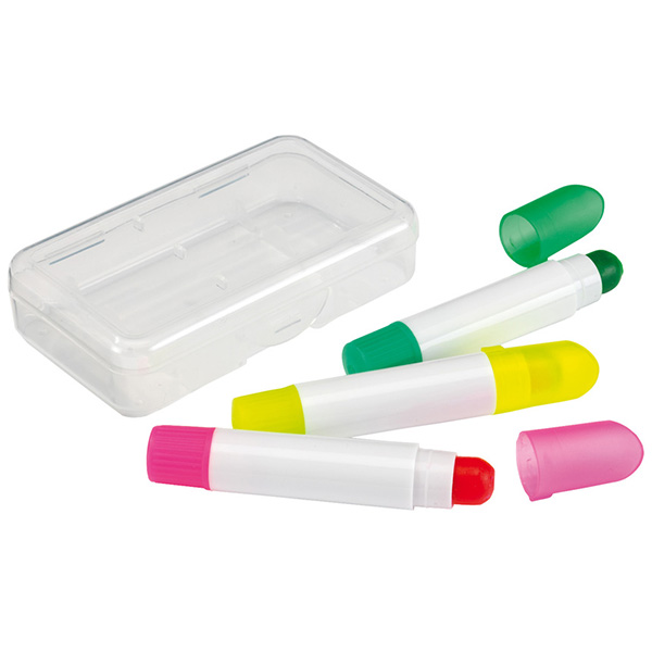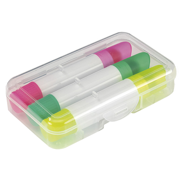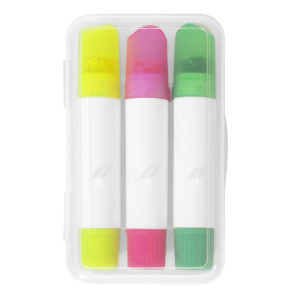 8,5 x 5 x 2 cm Plástico. Set de 3 resaltadores plásticos . Estuche plástico transparente. NO SE SECA.