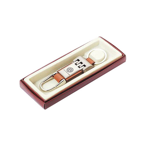 Llavero Metal-Cuero modelo «Premium». Presentación en estuche laminado café con cuna aterciopelada.