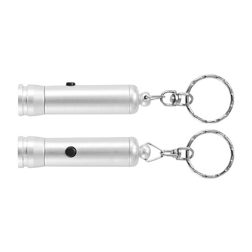 Llavero-Linterna LED plástica color plata. Usa 3 pilas botón (incluidas).