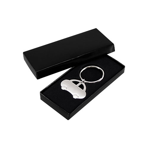 Llavero Metálico Automóvil. Presentación en estuche laminado negro con cuna aterciopelada.