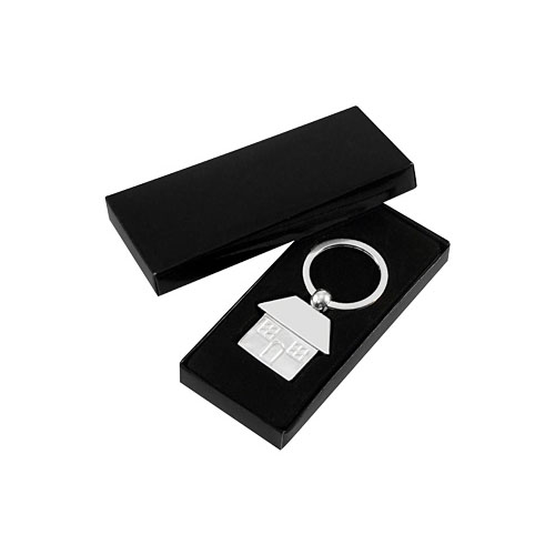 Llavero Metálico Casa, con reverso liso. Presentación en estuche laminado negro con cuna aterciopelada.