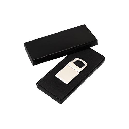 Llavero Metálico modelo «Lock». Presentación en estuche laminado negro con cuna aterciopelada.