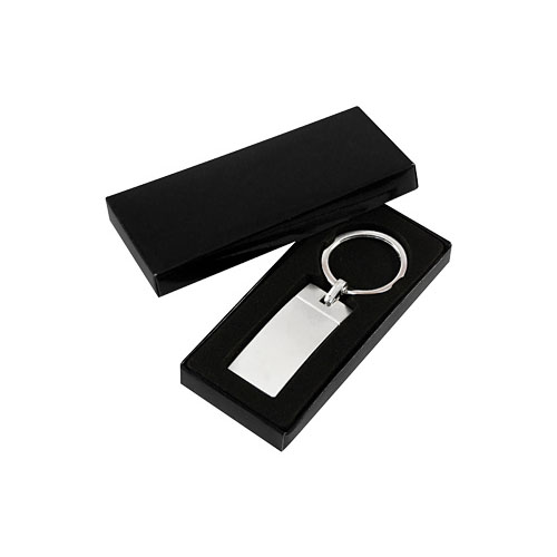 Llavero Metálico satinado, modelo «Wave». Presentación en estuche laminado negro con cuna aterciopelada.