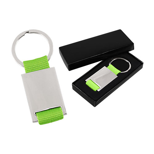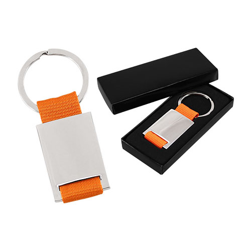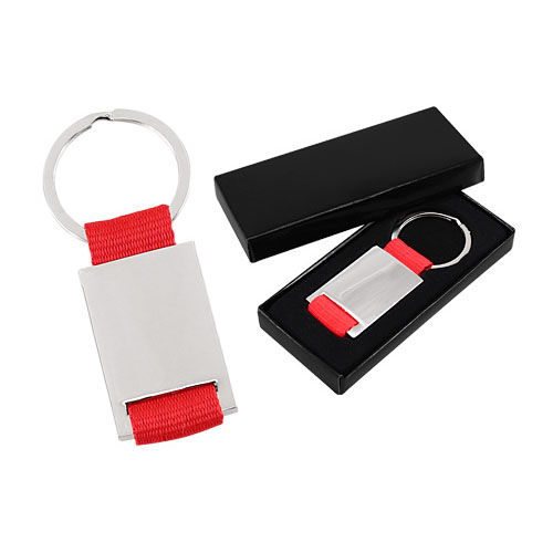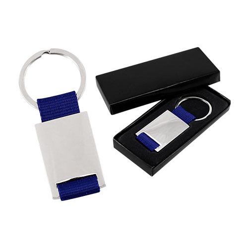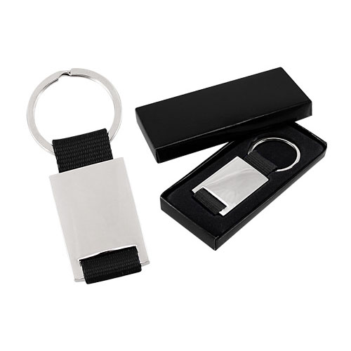 Llavero Metálico «Strap» con huincha de polyester de color. Presentación en estuche laminado negro con cuna aterciopelada.