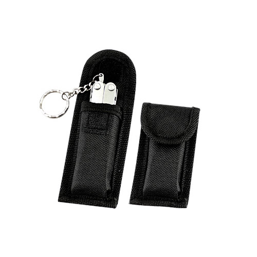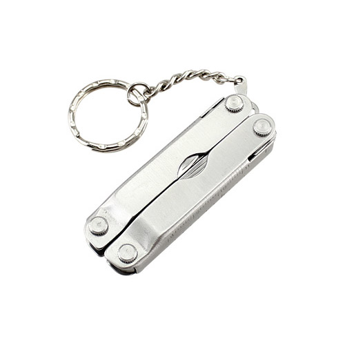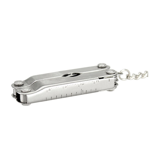 Multiherramienta metálica plegable de 10 funciones, con llavero. Incluye mini-regla en cm. y pulgadas. Presentación en estuche de polyester negro y caja plateada de regalo.