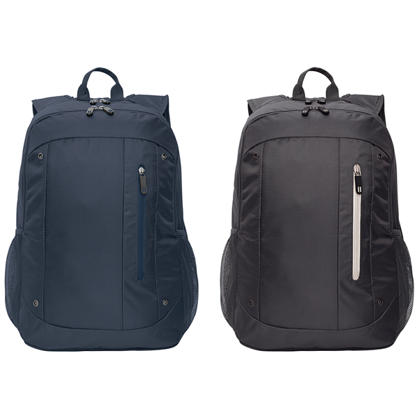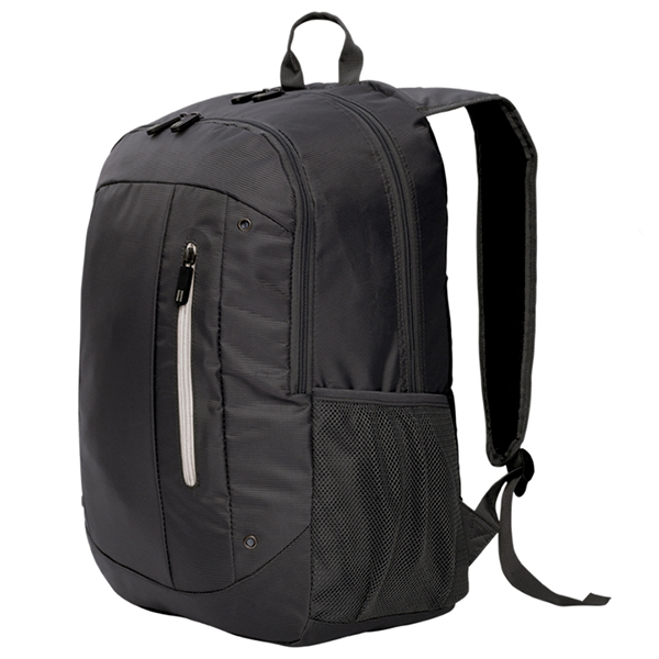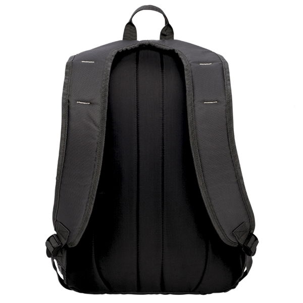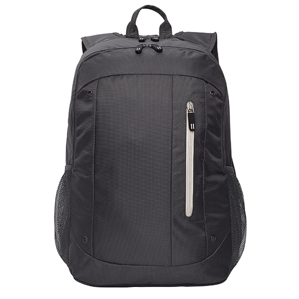 47 x 32 x 17 cm. Capacidad 25 litros aprox. Polyester. Mochila con dos compartimentos, el principal con división acolchonada porta notebook de hasta 15” con bolsillo y el segundo con tres espacios contenedores. En el exterior un bolsillo frontal pequeño con cierre en color y dos bolsillos de red laterales. Herrajes metálicos con tiradores de goma con detalles de color. Correas acolchonadas regulables.