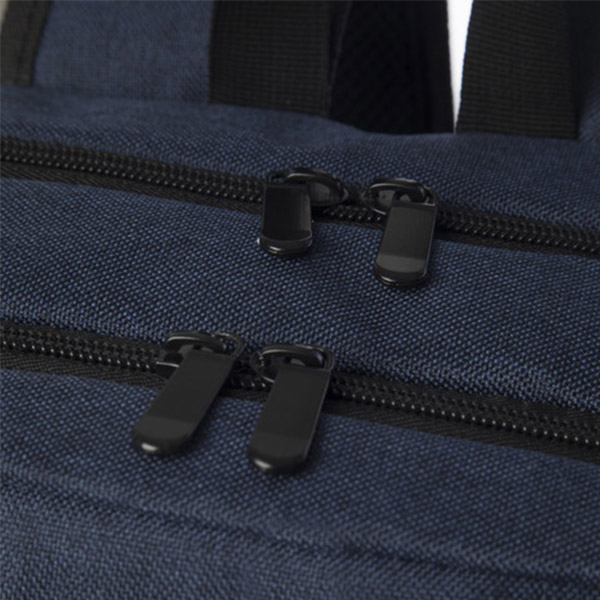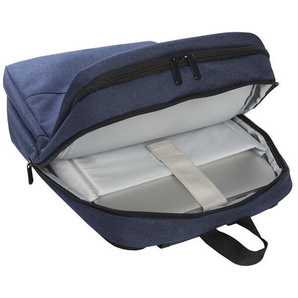42 x 28 x 12 cm. Capacidad 14 litros aprox. Poliester. Mochila portanotebook. . Amplio bolsillo frontal con cierre lateral. Posee 2 compartimentos acolchonados y forrados. El primero con un bolsillo de red con cierre, organizador con pequeños bolsillos, porta boligrafos y espacio para guardar una tablet. El segundo compartimento contiene bolsillo para notebook de hasta 15″. Correas y espaldar acolchonados con tela de red que permite la ventilación. Cierre con herrajes metálicos.