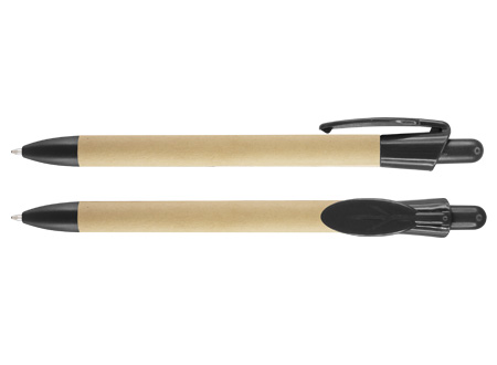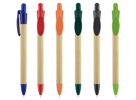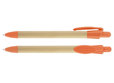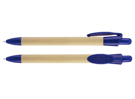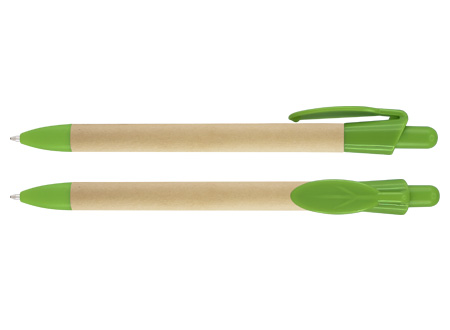 Bolígrafo Ecológico «Leave» con cuerpo de cartón reciclado y clip plástico PET biodegradable con forma de hoja. Escritura azul.