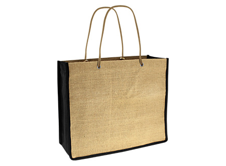 Bolso de Yute natural con fuelle y fondo en tela PET color negro. Cuenta con 2 asas de nylon color natural de 50cm. c/u aprox.