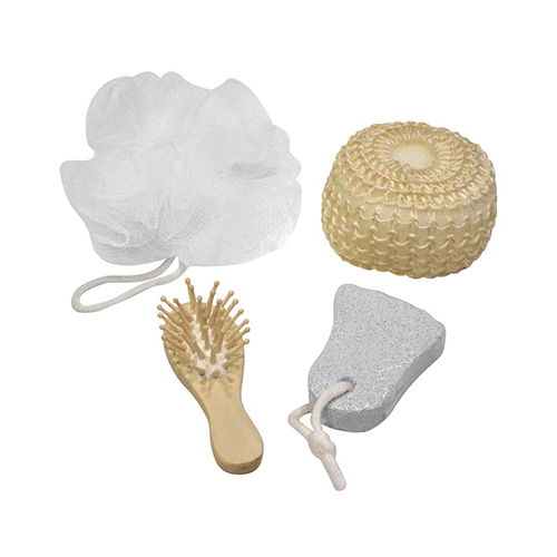 Canasto SPA de belleza en madera modelo «Naturals». Contiene cepillo de pelo, esponja malla, piedra pomez y esponja de masaje corporal.