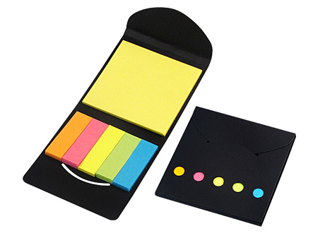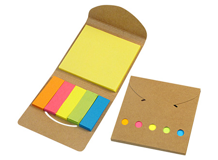 Porta Post-it Ecológico de Cartón reciclado. Incluye 1 taco post-it de 25 hojas de 7,5 x 7,5 cm + 5 tacos de 25 banderitas post-it de 5 x 1,5 cm.