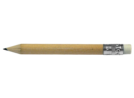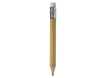 Lápiz grafito corto de madera barnizada. Cuerpo 100% cilíndrico, ideal para imprimir logos sin problemas. Incluye goma de borrar y viene con punta lista.