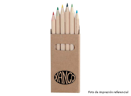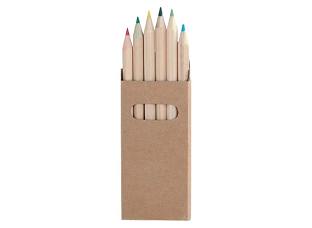 Set de 6 Lápices hexagonales cortos de colores, en Estuche rectangular de cartón reciclado con ventana.