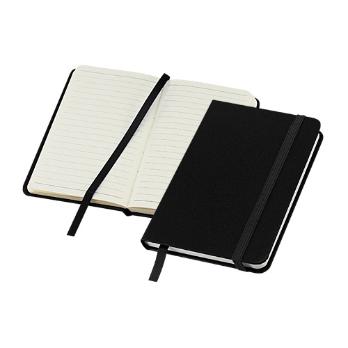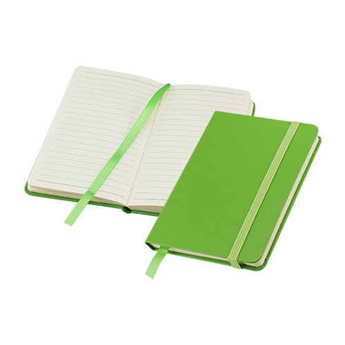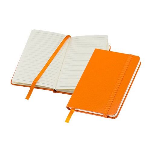 Libreta modelo «Colorskine» tamaño A6, con cubierta de cartón piedra forrada en PU simil cuero de color de 1.5mm de espesor. Interior 80 hojas lineadas amarillas de 80gsm. Incluye banda elástica y huincha separador de hojas al tono. Presentación individual en bolsa de polipropileno.