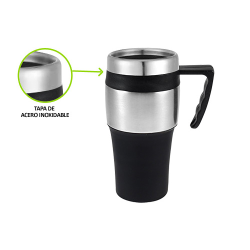 Mug térmico de doble pared aislante con tapa rosca de acero inoxidable y dosificador. Interior de PVC negro y exterior de PVC negro y acero inoxidable.