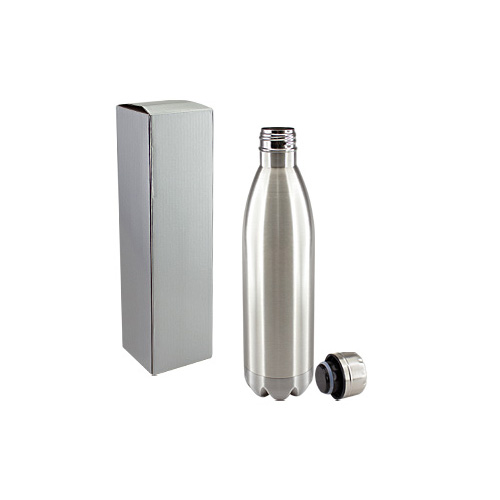 Termo modelo «Botella» de 3/4 litro, en Acero inoxidable, tapa rosca. Presentación en estuche de cartón laminado plateado.