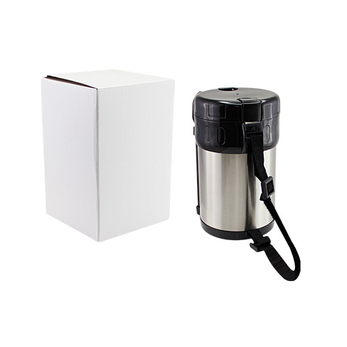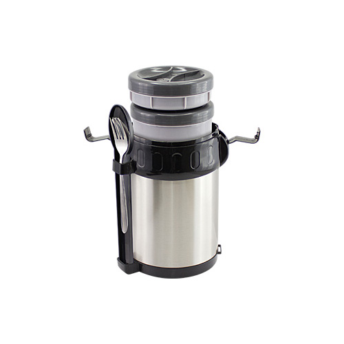 Termo de Acero inoxidable de 2 litros, con 3 compartimentos plásticos interiores independientes. Ideal para mantener alimentos tibios por más tiempo, para el almuerzo o la colación escolar. Incluye juego de cubiertos metálicos (tenedor y cuchara pequeños) en contenedor plástico negro. Presentación en estuche de cartón blanco.