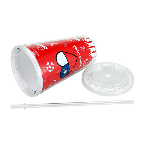 Mug vaso plástico transparente con gráfica interior «Vamos Chile». Incluye tapa rosca y bombilla.