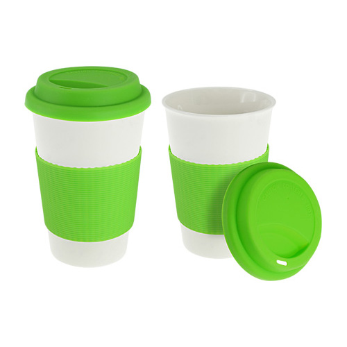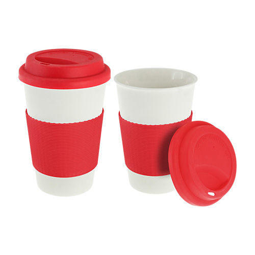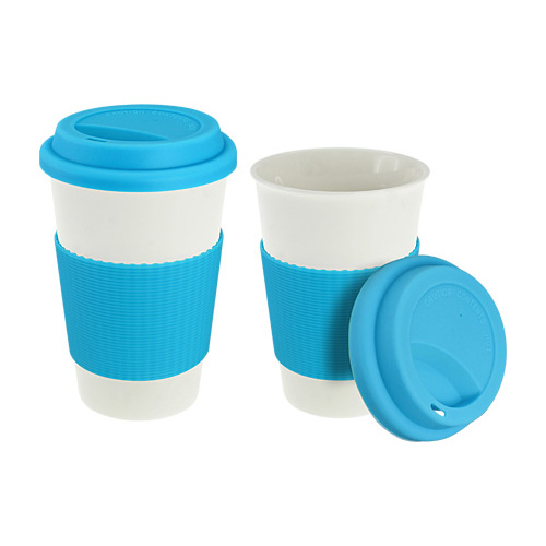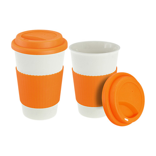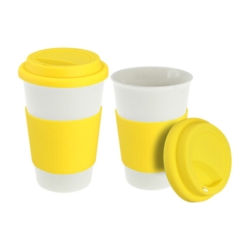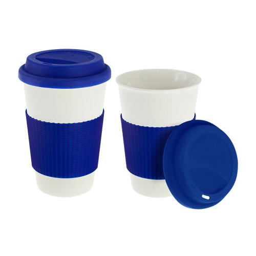 Vaso cerámico blanco de 400ml, con tapa y grip (mango) texturado de silicona de color. Presentación en caja de cartón blanco.