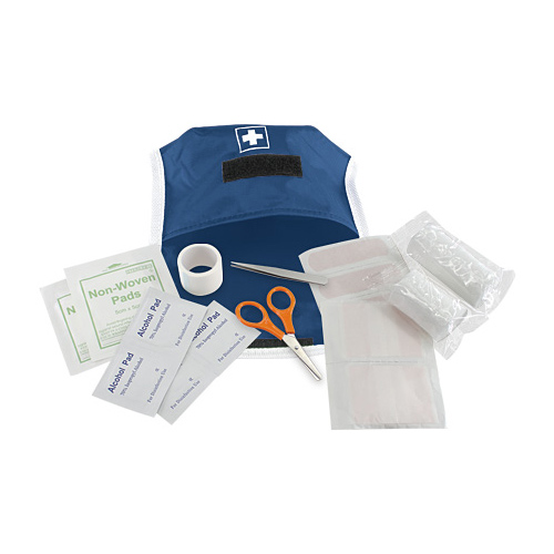 1 Tijera, 1 Pinza, 1 Rollo de Gasa elasticada de 3 x 7 cm, 1 Rollo de Gasa elasticada de 3 x 5 cm, 4 Toallas Húmedas con alcohol gel, 1 Cinta Adhesiva, 2 Parches Curitas de 6 x 5 cm, 2 Parches de Gasa estériles de 5 x 5 cm, 4 Parches Curitas bordes redondeados de 7 x 2 cm.