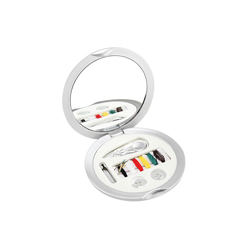 Set de Costura plateado redondo con espejo. Presentación en caja plateada de cartón.