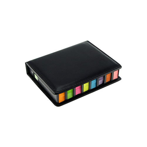 Memo Set de PU negro con Post-it y banderitas adhesivas. Incluye 200 post-it rectangulares + 200 post-it cuadrados + 1.600 banderitas adhesivas de colores. Superficie de PU liso, ideal para impresión.