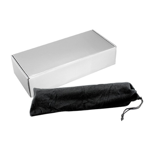 Bolsa aterciopelada negra. Presentación en caja de regalo plateada.
