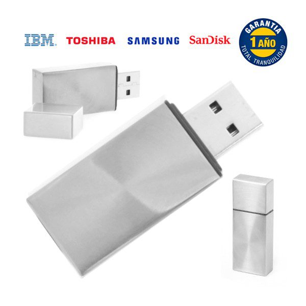 Chips Toshiba, IBM, Samsung, Sandisk. Garantia de 1 año. Entrega en 12-14 días habiles. Caja cartón incluida en el precio. Actualización de precios todas las semanas. Valor incluye logo en una posición en láser o impresión máximo 2 colores. Disponible en PLATEADO