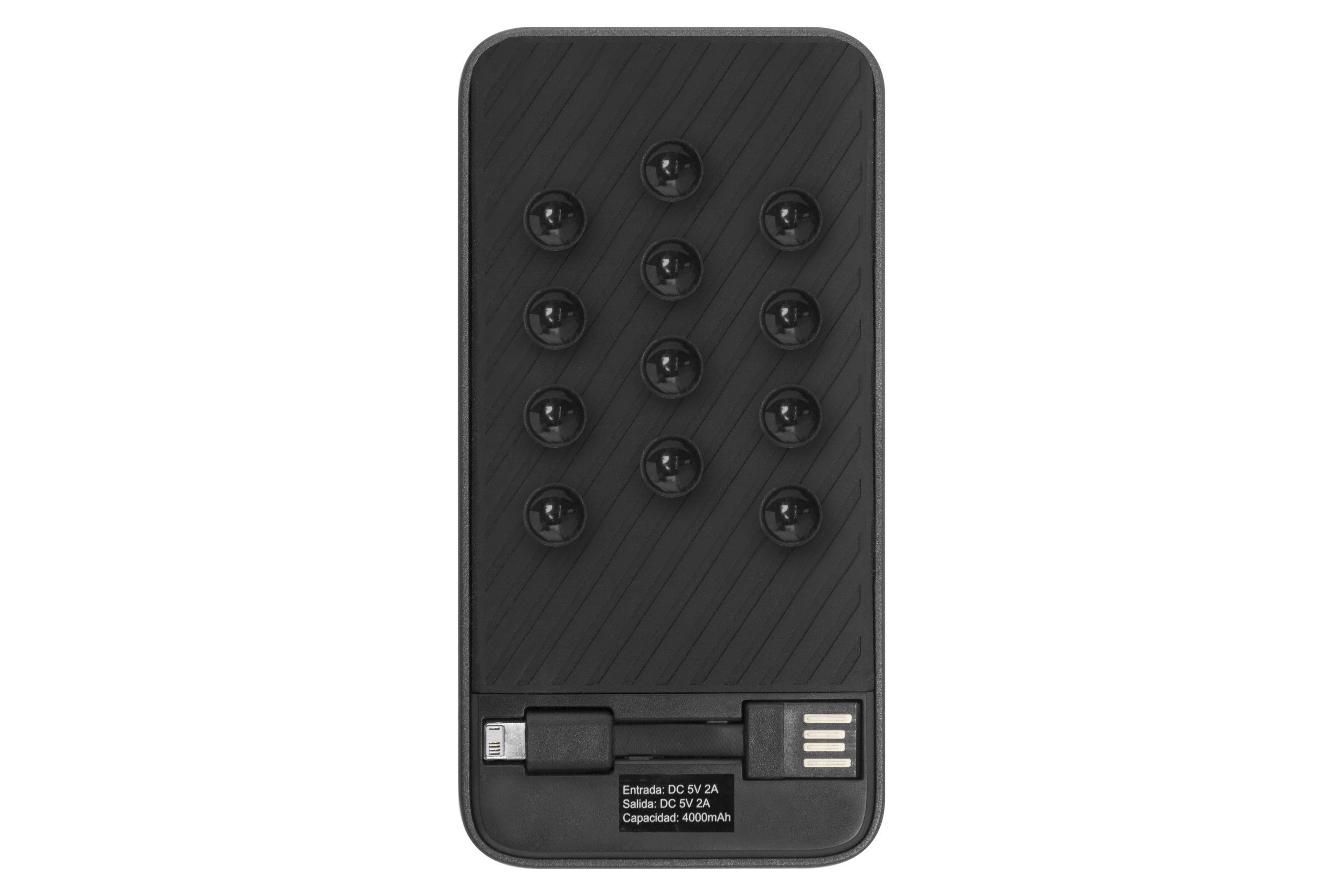 13 x 6,6 x 1,1 cm. Plástico. Capacidad 4000 MAH. Power Bank. En la parte de atrás engomada con ventosas que permite la adhesión en el dispositivo que se está cargando. Cuenta con espacio para guardar el cable USB. Dos entradas: una mini USB que permite cargar Iphone y Android y una entrada USB. La parte de adelante lisa con amplio espacio para personalizar.
