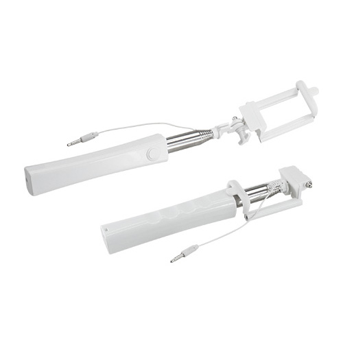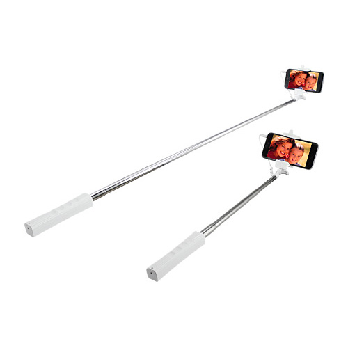 Palo extensible para Selfie «Monopod». Largo alcance de 150cm. con tu brazo extendido. Extensión total selfie-stick desplegado: 95cm. Cerrado: 30cm. Mango plástico blanco con buen área de impresión. Contiene cable de conexión y botón de disparo. No requiere aplicaciones extras para disparo.