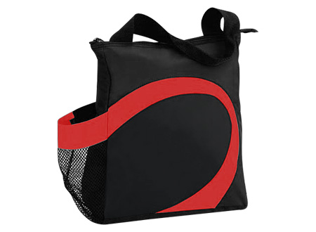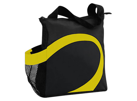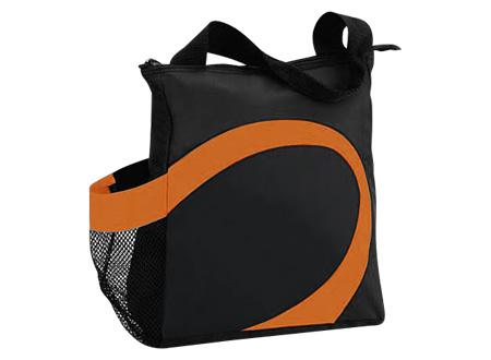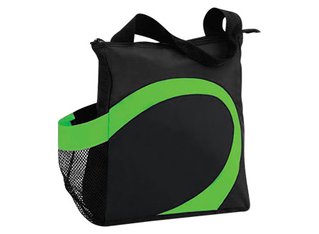 Cooler modelo «Wave». Tela exterior Polyester 70D/PVC. Tela interior plateada aislante 15C PEVA + relleno 3mm esponja PE. Cierre cremallera superior. Incluye bolsillo lateral en tela malla.