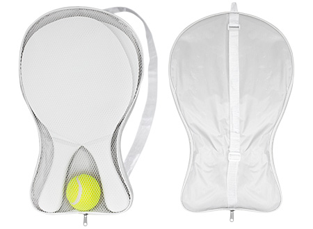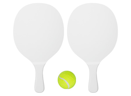 Set de Paletas de Playa de MDF esmaltado de 12mm. de espesor, modelo «Premium». Incluye bolso de tela poliéster blanco con frente malla y cinta para colgar + pelota de tenis amarilla. Cada paleta viene dentro de bolsa de polietileno.
