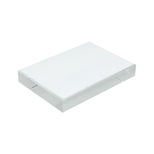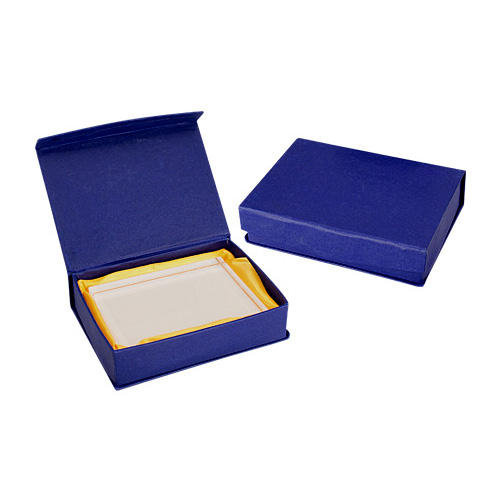 Trofeo rectangular de Cristal sólido para Sublimación. Presentación en caja de cartón azul con cuna amarilla.