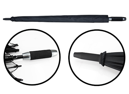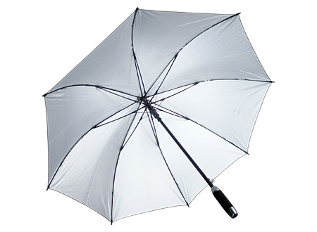 Deluxe Paraguas de Golf con 8 cascos de tela 190T PONGEE reverso cobertura plateada con protección UV. Cuerpo y varas reforzadas de Fibra de Vidrio, sistema de apertura automático. Mango recto de EVA negro y aluminio anodizado. Incluye funda al tono de 190T PONGEE.