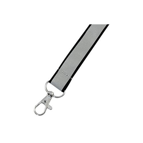 Lanyard Reflectante Plateado. Reverso polyester negro de 2 cm de ancho, con terminación mosquetón metálico.
